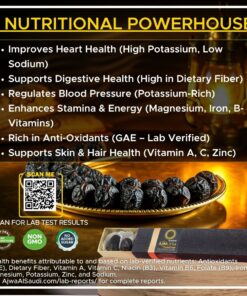 Beyond being a delicious treat, our Ajwa dates are an all-natural nutritional powerhouse. They are free from artificial colors, flavors, and preservatives. Loaded with essential vitamins like Thiamin, Riboflavin, Niacin, Folate, Vitamin A & Vitamin K, and minerals like Calcium, Iron, Phosphorus, Sodium, Potassium, Magnesium & Zinc, they make for an ideal healthful snack. They are rich in iron, potassium, sodium, and fluorine, providing instant energy and aiding in improving the digestive system.