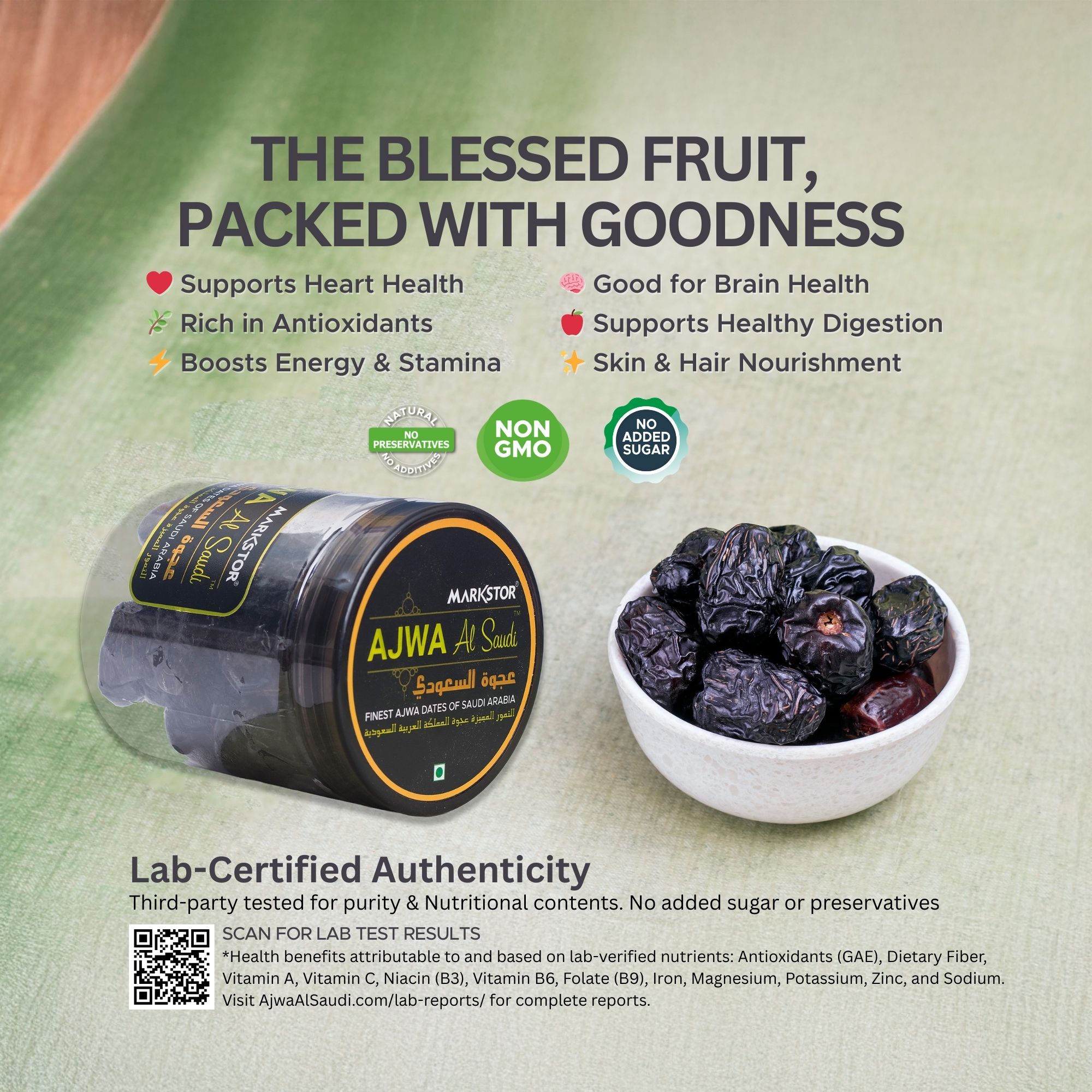 At Markstor, each product is packed with love and care. Our Ajwa dates are stored in a food-grade, recyclable box to maintain freshness. With a focus on hygiene and quality, we make sure every box is packed with the utmost attention to detail. The commitment to quality doesn’t stop there. Each batch of our Ajwa Al-Saudi dates undergoes rigorous lab testing for biological contaminants, ensuring adherence to the highest safety and hygiene standards.