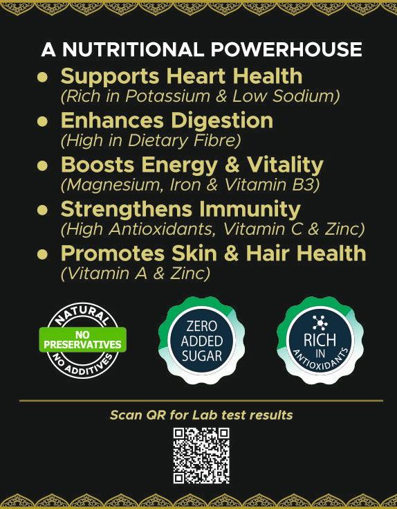 Beyond being a delicious treat, our Ajwa dates are an all-natural nutritional powerhouse. They are free from artificial colors, flavors, and preservatives. Loaded with essential vitamins like Thiamin, Riboflavin, Niacin, Folate, Vitamin A & Vitamin K, and minerals like Calcium, Iron, Phosphorus, Sodium, Potassium, Magnesium & Zinc, they make for an ideal healthful snack. They are rich in iron, potassium, sodium, and fluorine, providing instant energy and aiding in improving the digestive system.