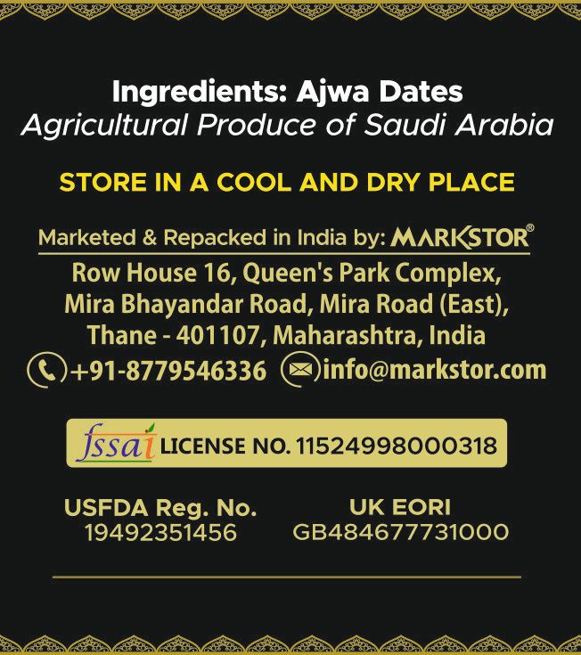 As the choicest dates for festivals, gifts, and daily consumption, Markstor brings quality fresh produce from the Middle East, Europe, and Africa to our customers in India. Embrace a wholesome lifestyle with our Ajwa Al-Saudi dates and experience the superior taste and quality that Markstor offers. Our commitment to maintaining the highest standards of food safety makes us a trusted choice for all. Enjoy the original “sweets” of nature and boost your health with Markstor Ajwa Al-Saud Dates.